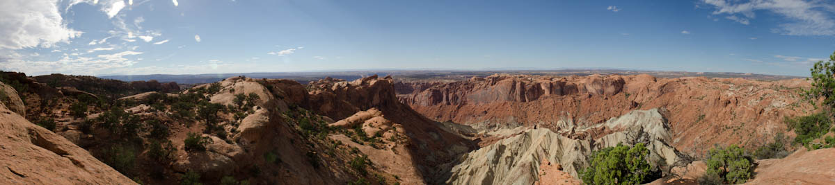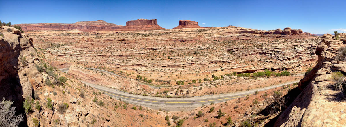 Despite that inauspicious start, my temperament quickly improved once we hit the road and began to push towards Canyonlands National Park. The park isn’t quite as close to Moab as Arches had been but it was still a very manageable hop to get there. The way began as a cross-desert trek through red dirt country and finished with long climbs among the layered cliffs and rounded domes and scraggly trees that make this part of the country unique.