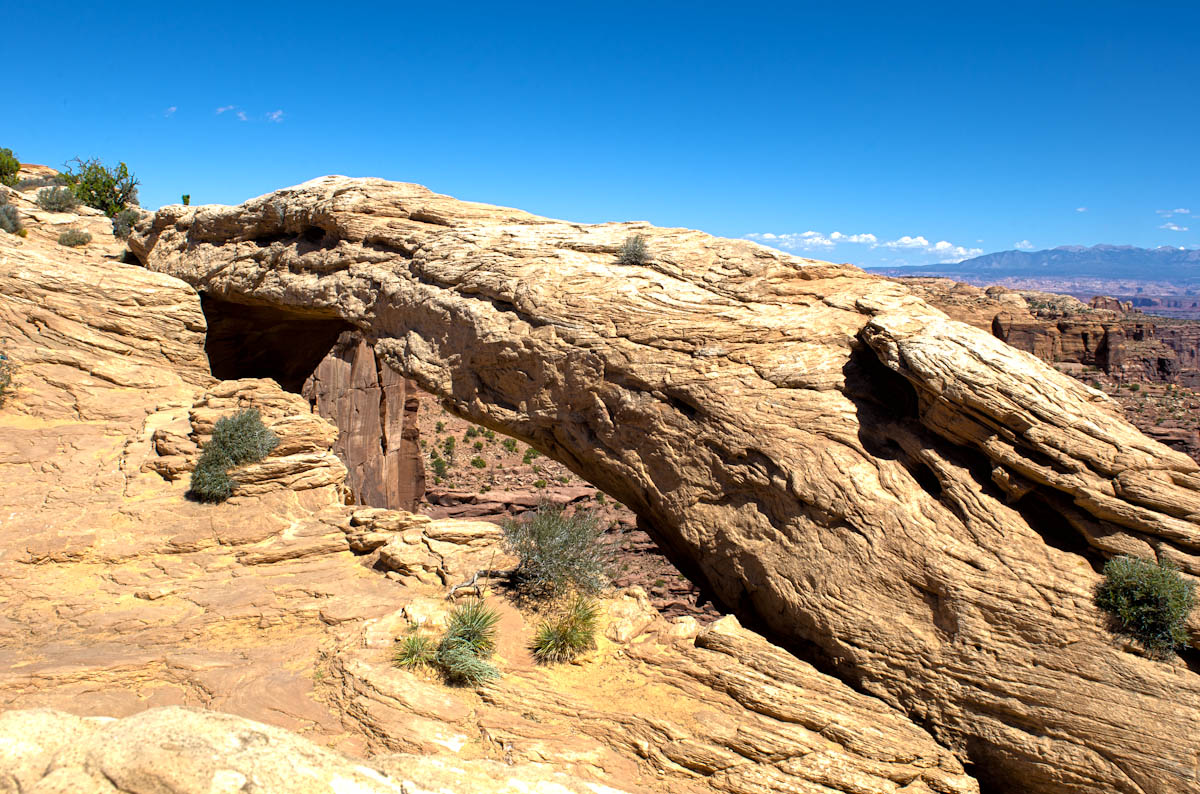 Our first stop was the Mesa Arch, one of the most prominently photographed arches in the world. It is particularly known for the views at sunrise, when the light hits its underside, painting it a bright orange, and perfectly frames the hundred-mile view through its middle. We arrived closer to midday and so missed that particular effect but enjoyed seeing it nonetheless. The sandstone at Canyonlands was lighter and more prone to breaking off in your hands than the red slickrock of Arches, so it made for a different style of arch than we’d seen the previous day.