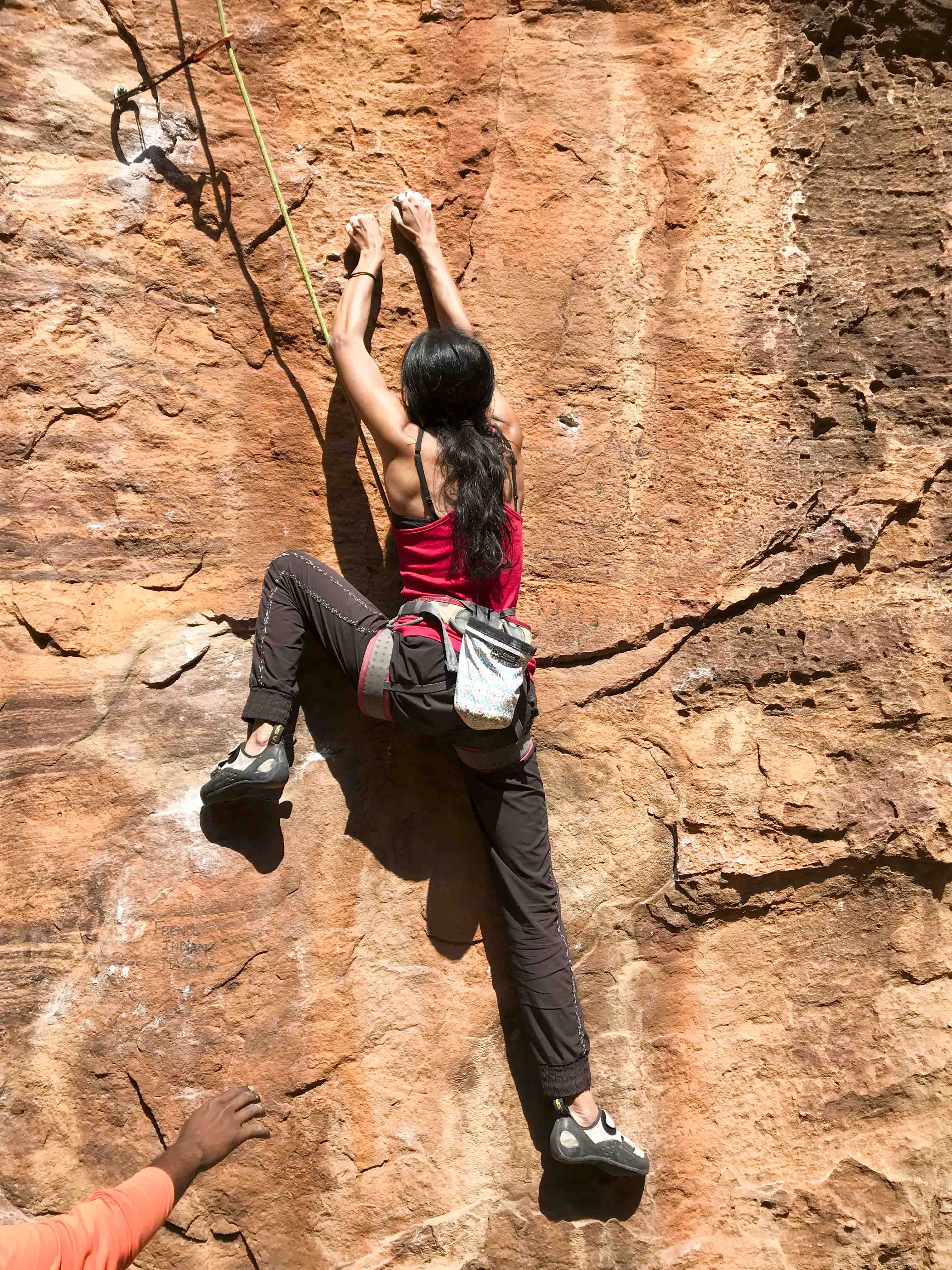 Since my first outdoor climb clearly wasn't enough of a milestone, I was encouraged to try my first lead climb on a more challenging route that same evening. In typical Indian fashion, questions about my readiness and safety were met with a shrug like I was the weird one for asking. We relocated to another part of the complex and settled in to the route, which was called Master Biscuit. The training I received was a cursory pep talk and a "go get 'em".