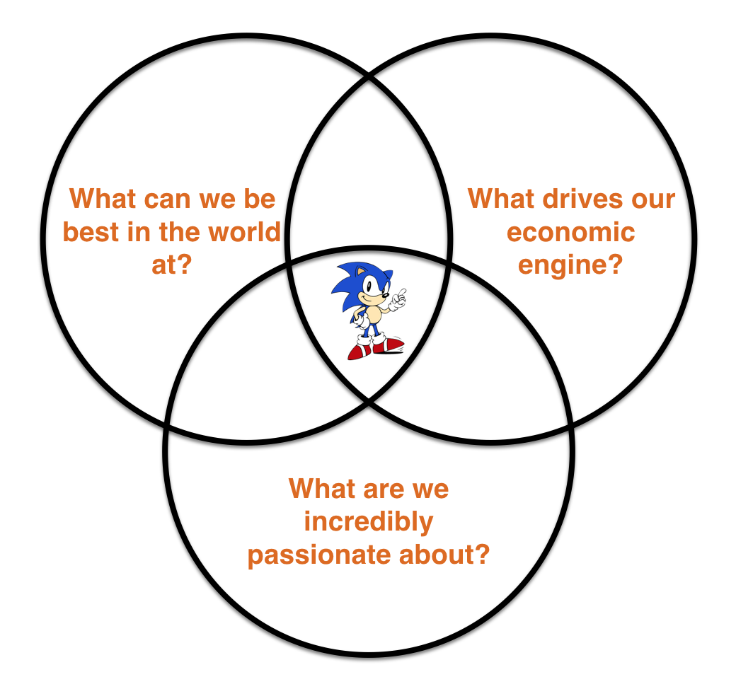 In business, the recipe for discovering your Hedgehog looks like a simple Venn Diagram of overlapping circles. Where they meet in the middle, you will find what you should pursue to the exclusion of all else. If you can't meet the specified criteria, it's time to seriously reconsider your business.