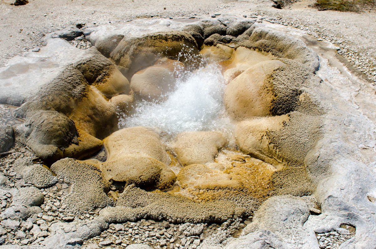 Eventually the trees peeled back and the ground calcified into hardened, colorful fields of geysers. It’s difficult to stand next to a geyser and not be impressed with how very *different* it is from almost anything else you see in nature. The holes are bursting with steam and color and an inorganic sort of life and personality. Some just bubble quietly along while others steam softly until they rumble forth and spew lustily into the air for several minutes before quieting down again.